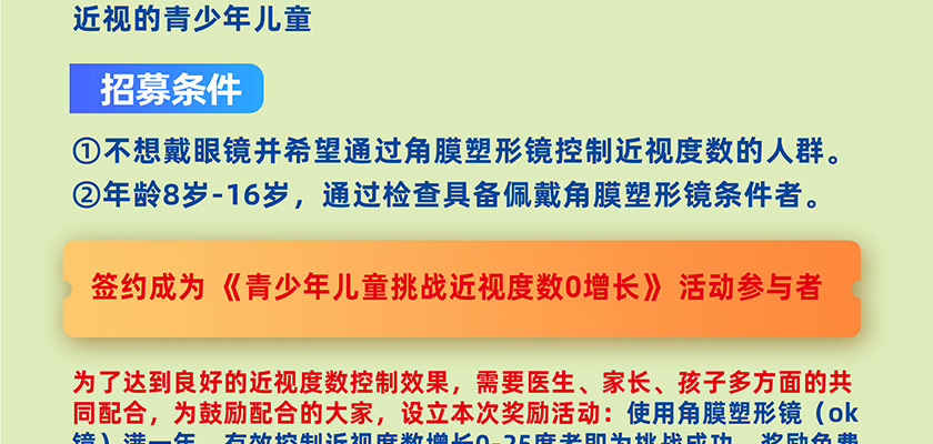 免费签约 | 挑战青少年儿童近视0增长。 2020-09-02 13:42:42 98次阅读 上一页: 暑期19.9元医学验光 返回列表 下一页: 视光中心全线项目8折 便捷服务 在线咨询 最新活动 来院路线 自助预约 咨询费用 就诊流程 最新文章 近视手术防坑指南 瞳孔的秘密:关于瞳孔你了解多少? 白内障术中小瞳孔的危险因素 来,让我们为你再造一个新瞳孔! 这个五一,因你而“睛彩”